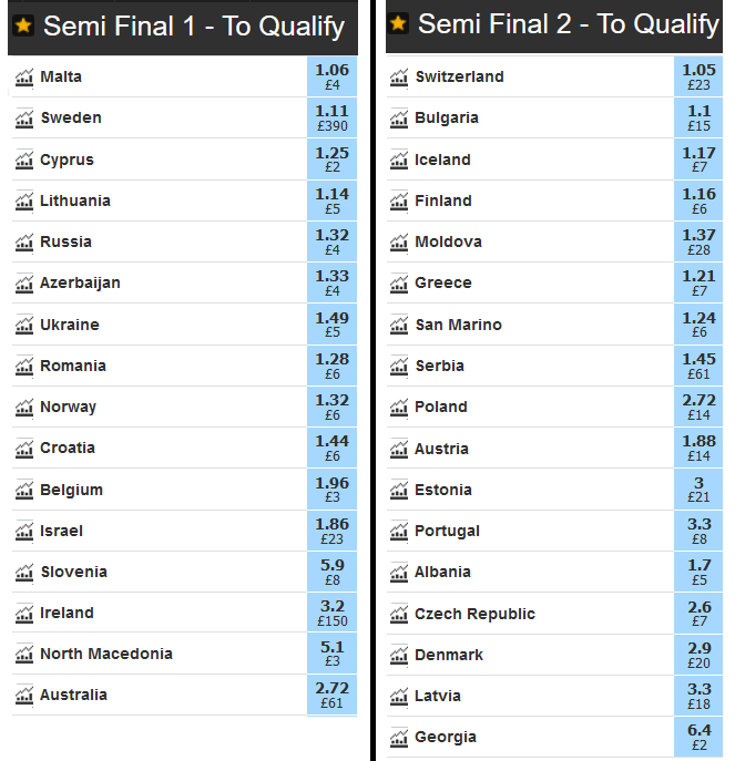 Before we can get to the winner market (of which more below!), there’s the small matter of finding out which 20 songs will join the pre-qualified automatic finalists in the grand final. The “To Qualify” market asks a simple yes/no question: Will Country X be in one of the lucky (virtual) envelopes at the end of its semi-final?